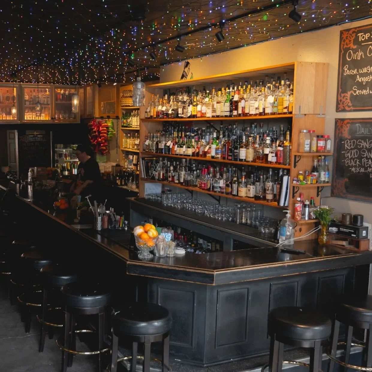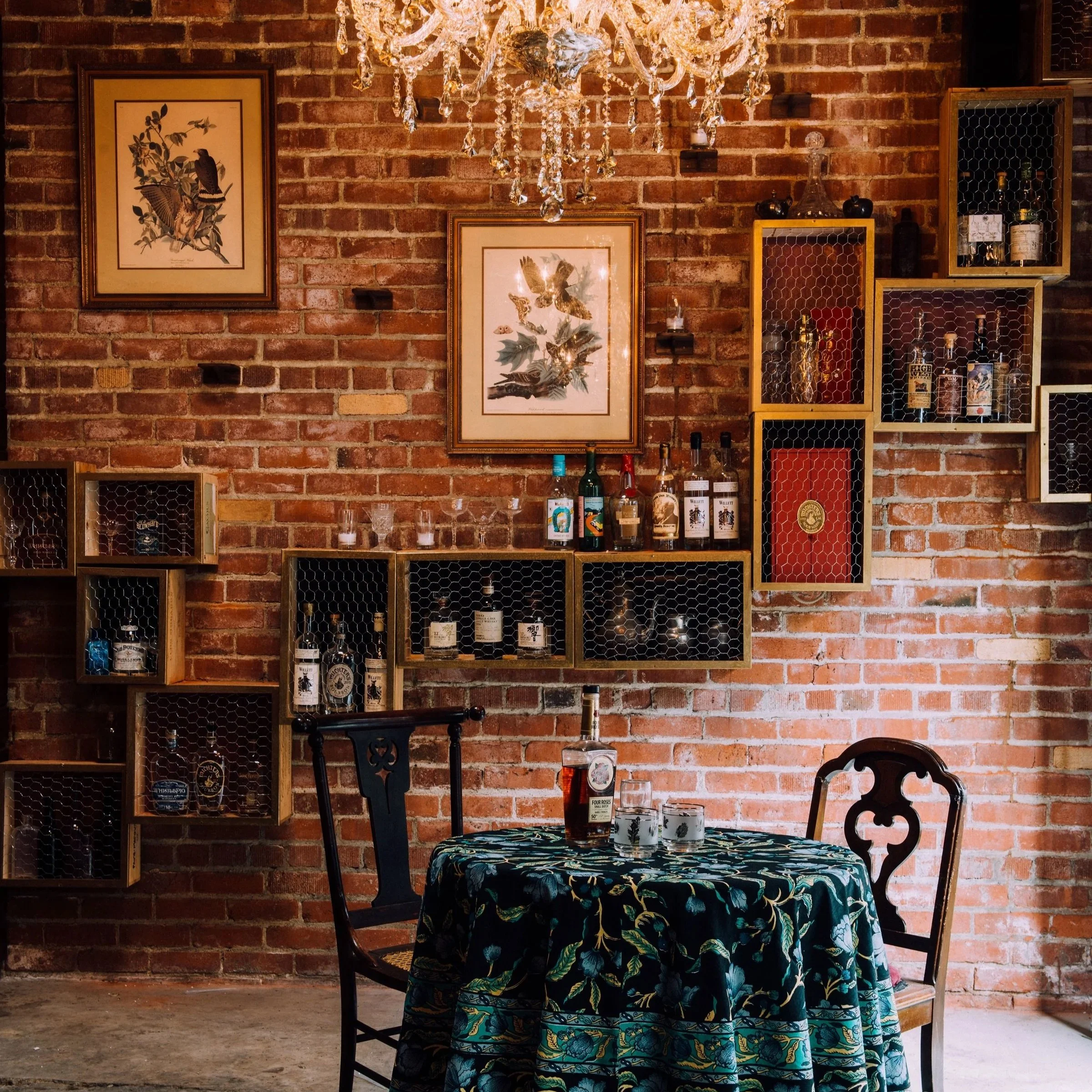 A comfortable, relaxed bar environment with custom whiskey bottle chandeliers, a view of the 1200 bottle collection, and a jukebox. Spread out with your group and relax with a fully private bar experience!