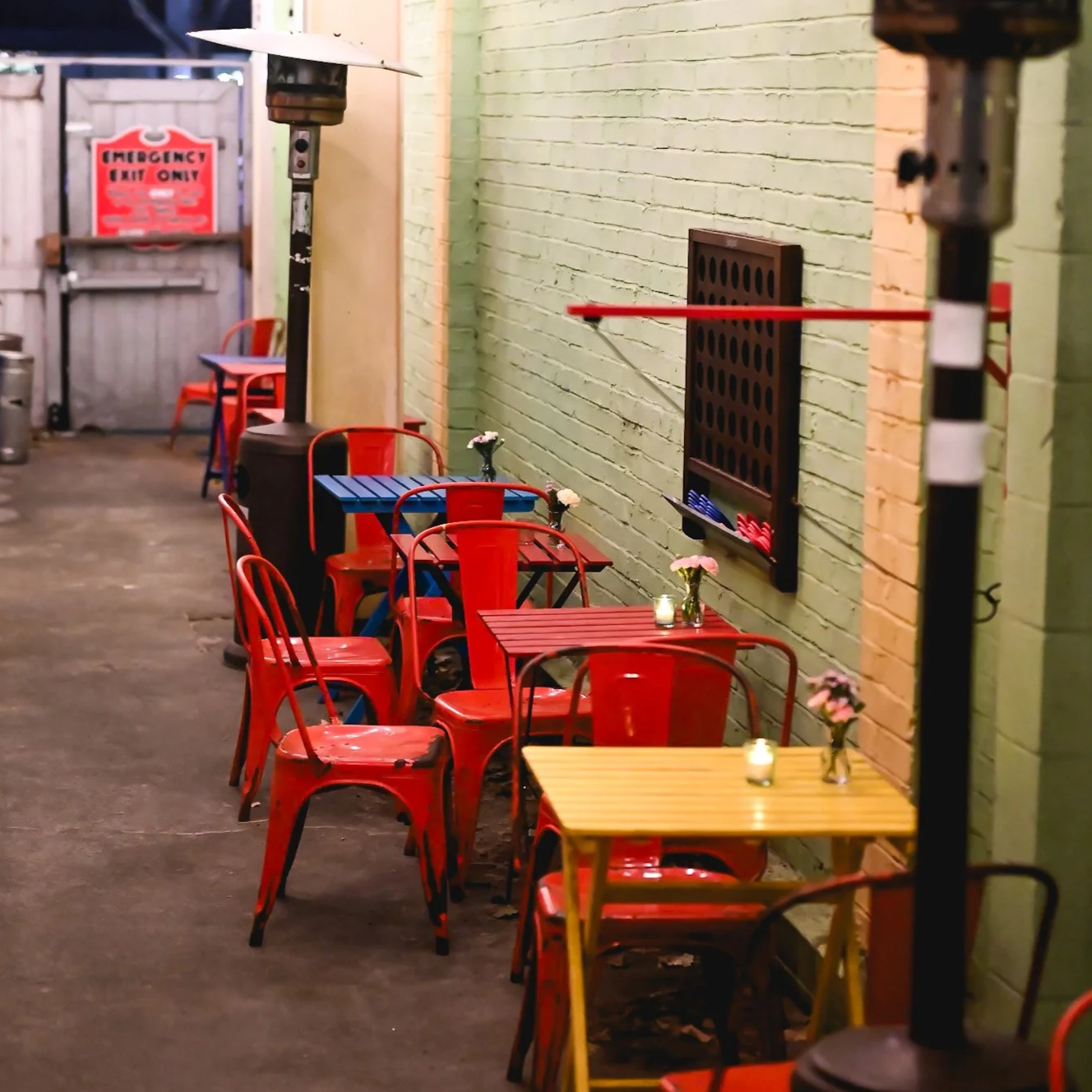 A warm and welcoming patio with lovely string lights, heaters, bright colorful tables and chairs, a custom redwood bar with flowers cascading down above it, and free outdoor games! We have 2 giant Connect Four sets, 1 Plinko game, and 1 Hook & Loop game.